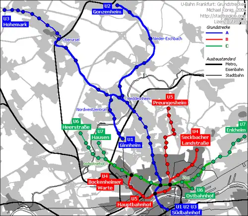 5. ^ Schwandl, Robert. "FRANKFURT am Main". UrbanRail.net. Retrieved 27 July 2014. The Frankfurt "U-Bahn" is not a real metro, but rather a typical German Stadtbahn (like that of Stuttgart, Dortmund or Hanover), i.e. some sections in the city centre were built to full metro standards, whereas others along outer sections have level crossings, in the case of line U5 even some on-street running.