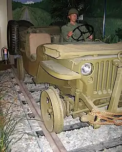 World War II receives coverage with several exhibits including Operation Mulberry which was an operation to construct two artificial harbors on the Normandy coast to support the invasion. This operation used 158 tugboats including 74 of the Army's "small tugs" to tow 59 Gooseberry derelict ships to be sunk as breakwalls and the Phoenix caissons and Lobnitz floating piers.[8] Another exhibit focuses on the Red Ball Express, the massive supply operation that supported Patton's advance after D-Day. The exhibit includes photos and paintings of the trucks as well as a diorama of a rest stop/repair depot featuring cargo trucks and a wrecker. Additional materials address the massive fuel and oil consumption needs as well as soldier experiences.[9]