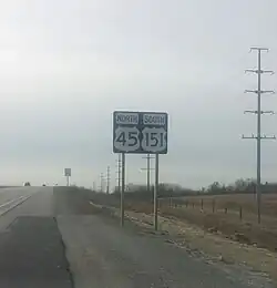 A wrong-way concurrency: northbound US 45 and southbound US 151 south of Fond du Lac, Wisconsin (actual direction of travel is westbound)