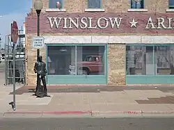 About 3.8 miles (6.1 km) southeast of exit 230, and after passing the access road heading south to Meteor Crater, US 66 curved northeast to cross I-40, then made a gradual curve to the southeast. Shortly afterward, US 66 crossed I-40 a second time, where the westbound Meteor Crater Rest Area sits today. Immediately after crossing I-40, US 66 curved northeast to cross over I-40 a third time along with the Santa Fe Railway, then made a sharp turn to the east, followed by a gradual curve to the southeast. At I-40 exit 239, US 66 took the abandoned roadbed back to I-40 and followed the route of the present-day Interstate. About two miles (3.2 km) southeast of exit 239, US 66 left I-40 again onto an abandoned roadbed between the current Interstate and the Santa Fe Railway heading southeast, eventually crossing into Navajo County. Where the I-40 Industrial Spur crosses the railroad, the abandoned roadbed, which carried US 66, tied into "Old West Highway 66", where the highway entered Winslow.[11][16] At the intersection with current SR 99 (former I-40 Business), US 66 headed southeast into downtown Winslow onto Second Street. Through downtown, US 66 passed the Winslow Visitor Center and Standin' on the Corner Park.[11][16] At the intersection with Williamson Avenue, where SR 99 turns south with southbound SR 87, US 66 met SR 65 at its northern terminus.[2][16] From here, SR 65 headed south to its other terminus at the Coconino National Forest boundary, while US 66 continued southeast on present-day northbound SR 87 out of town.[2][16]