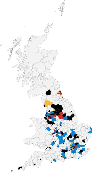 Colours denote council control following elections, as shown in the main table of results.