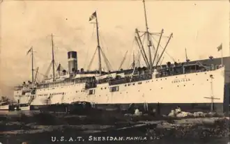Sheridan began a regular shuttle service between San Francisco, Honolulu, Guam, and Manila. The Army Transport Service maintained a roughly monthly schedule of sailings from San Francisco using Sheridan, USAT Logan, USAT Sherman, and USAT Thomas. The ships carried supplies, cash,[65][66] and fresh troops to the Philippines, and relieved, discharged, wounded, and dead troops back to the United States.[67] Many officers brought their wives and children aboard as cabin passengers.[68] In addition to Army personnel, the ship also routinely transported US Marines, and US Navy personnel.[69]