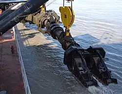 Essayons sucks sand, silt, and mud off the bottom of navigable waterways to increase their depth, creating a channel allowing larger ships to pass. She pulls two suction heads, referred to as "drag heads", along the seafloor as she moves slowly through the water. The drag heads are connected to pipes which are 28 inches (71 cm) in diameter called "drag arms" that descend from both sides of the ship. These drag arms are controlled by two winches each which can lower them to reach bottom as deep as 94 feet (29 m). Loose material on the seafloor enters the drag heads and is pulled up through the drag arms by powerful pumps. It is then deposited in a hopper in the middle of the ship. The ship reaches capacity after about 45 minutes to an hour of dredging. When the hopper is full, the ship sails to an offshore location and opens doors in the bottom of the hopper, allowing the dredge spoil to fall to the sea bottom.[10][16]