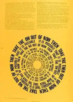 Our work was really drawn from McLuhan. We looked at McLuhan as the theoretician–and we were the practitioners...We had a mission to bring about public awareness of the impact that all this instantaneous communication was having and was going to have–to attempt to be prepared for it and to change it if necessary.[2] Prior to Gerd Stern's move to New York, while still in the San Francisco Bay Area, he began to project slides of words found on street signs, forming a poetry collage later known as Verbal American Landscape. After invited to give a poetry reading at the San Francisco Museum of Art, Stern instead staged a two-night performance in November 1963 titled Contact Is the Only Love, which involved sixty-four performers. The slides were shot by Stewart Brand. Callahan (in his late teens) assisted with audio, using equipment borrowed from the San Francisco Tape Music Center. Stern and Callahan created a four-channel mix of conversation, announcements, and popular music by simultaneously playing, mixing, and switching four pre-recorded tapes and live cut-ups of radio.[2][3][12][14]