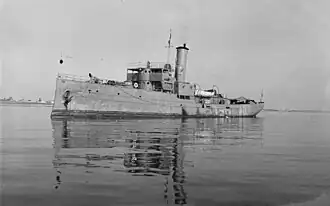 Gresham was refitted with three 4-inch guns and sixteen 300-lb depth charges. She then served as a coastal convoy escort and patrol gunboat during the war.[2] On 27 October 1917, Capt. B. H. Camden and several Gresham crewmembers received letters of commendation for having come to the aid of the five-masted schooner Dorothy Palmer. On 3 September 1918, Captain B. M. Chiswell, gunner F. W. Sarnow and boatswain H. B. Berg received letters of commendation for destroying the wreck of the four-masted schooner Madrugada off Winter Quarter Shoal near Virginia[8] after she had been attacked by SM U-117 on 15 August.[9]