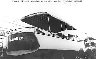 Ahdeek was built as a private single-screw wooden-hulled motorboat in 1916 by the Charles L. Seabury Company and Gas Engine and Power Company at Morris Heights in the Bronx, New York, for H. V. Schieren. On 7 April 1918, the 3rd Naval District inspected her for possible U.S. Navy use as an "aeronautic patrol"[2] boat during World War I. Ordered taken over by the Navy on 12 June 1918, she finally was acquired by the Navy on 2 September 1918 and assigned the section patrol number 2589. She was commissioned as USS Ahdeek (SP-2589).