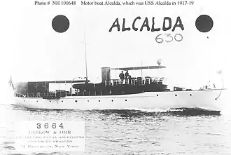 —a yacht built in 1910 in New York at Port Jefferson on Long Island by I. M. Bayles & Sons—was acquired by the Navy on free lease from Mr. Farley Hopkins on 12 May 1917 though she was officially commissioned on the day before the transaction was completed. The vessel patrolled the waters of the 2nd Naval District to prevent incursions by German U-boats and to locate any mines laid by either U-boats or surface raiders. Alcalda was returned to her owner on 11 January 1919, and her name was stricken from the Navy list on that same day.