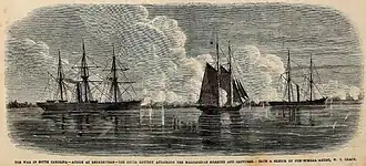 Firing on Fort McAllister from the right foreground are mortar schooners, including C.P. Williams, Norfolk Packet and Para.