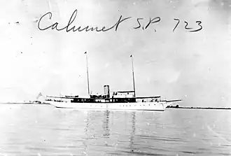 Calumet was built as a private steam yacht of the same name in 1903 by George Lawley & Son at Neponset, Massachusetts. On 9 September 1917, the U.S. Navy acquired her under a free lease from her owner for use as a section patrol boat during World War I. She was commissioned as USS Calumet (SP-723) on 7 December 1917.
