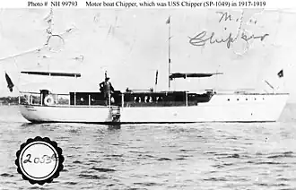 Chipper was built as a civilian motorboat of the same name in 1909 at Morris Heights in the Bronx, New York. The U.S. Navy leased her on 21 July 1917 for World War I service as a patrol vessel. She was commissioned as USS Chipper (SP-1049) on 24 July 1917.