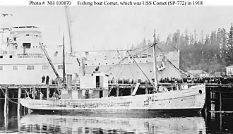 ![]() Comet as a commercial fishing trawler, apparently at the Puget Sound Navy Yard in Bremerton, Washington, probably around the time of her November 1917 acquisition by the United States Navy.