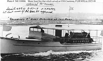 Courtenay P was built as a private motorboat of the same name in about 1916 by the Gas Engine and Power Company at Morris Heights in the Bronx, New York. On 5 July 1917, she was ordered delivered to the U.S. Navy for use as a section patrol boat during World War I. She was commissioned as USS Courtenay P (SP-899) on 30 August 1917. In 1918, her name was changed to USS SP-899.