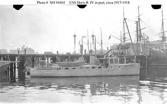 ![]() USS Doris B. IV (SP-625) sometime between 1917 and 1919, probably at the Boston Navy Yard in Boston, Massachusetts, with the masts of USS Constitution in the right background.