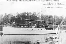 This article incorporates text from the public domain Dictionary of American Naval Fighting Ships. The entry can be found here.- Department of the Navy: Navy History and Heritage Command: Online Library of Selected Images: Civilian Ships: USS Elsie III (SP-708), 1917-1919. Used to be the civilian motor boat Elsie III (Built 1912)