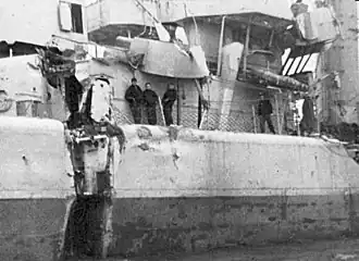 Endicott rejoined the fleet on 12 July and escorted LSTs and LCIs into the Mediterranean for the buildup preparatory to the attack on southern France (Operation Dragoon). The destroyer, together with British gunboats Scarab, Aphis, and 17 motor torpedo boats, was scheduled to make a diversionary attack against the coast at La Ciotat. The feint successfully deceived the enemy and Endicott sank a German merchantman during the bombardment. She then hastened to rescue the British gunboats in their uneven match against two German warships, Nimet Allah and Capriola, and though battle weary she destroyed both. In the action she was hit by one shell; although a dud, it still tore a large hole in the ship and wounded a man. She continued to support coastal operations off southern France by escorting a convoy to Corsica, and HMS Eastway to Salerno.