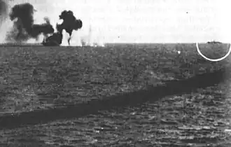 Around 08:20, Gambier Bay was crippled by a shell hit which flooded her forward engine room, immediately cutting her speed to 10 knots as she gradually slowed until dead in the water 15 minutes later.[9] The damage was initially recorded as a high explosive 8-inch (203 mm) cruiser shell. However, Japanese records disprove this and insist the hit was scored by an 18.1-inch (46 cm) shell from Yamato from around 20,000 yards.[10] On paper, the difference between a cruiser round and a battleship round should have been apparent, but Yamato, having mistaken Gambier Bay for a full-sized fleet carrier, was firing armor-piercing shells that over-penetrated her hull without exploding.[7][11] Most photographs of Gambier Bay under fire show her under attack from six-gun salvos and white splashes, corresponding with Yamato's gun layout, firing angle, and undyed shells. The Japanese heavy cruisers also never switched to high explosive shells (as evidenced by the damage inflicted to USS Kalinin Bay and USS Fanshaw Bay by Tone and Haguro), thus any cruiser shells that hit the ship would not have exploded.[12]