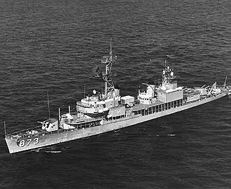 Reclassified DD-873 on 1 April, Hawkins completed FRAM late in 1964. Assigned to Destroyer Squadron 24, she operated out of Newport until departing 29 September for duty in the Far East. Steaming via the Panama Canal and the West Coast, she joined the 7th Fleet on 23 November. For the next three months she guarded aircraft carriers in the South China Sea and the Gulf of Tonkin and provided gunfire support for ground troops along the coast of South Vietnam. She departed Subic Bay late in February 1966, steamed via the Suez Canal, and arrived Newport 8 April.