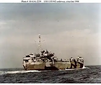 ![]() USS LST-942 under way soon after completion, c. late 1944. LST-942 is painted in Camouflage Measure 31, Design 8L or Design 18L.