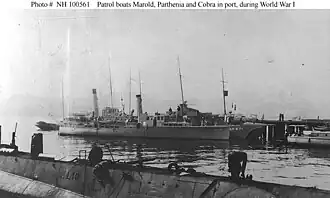 ![]() In a New England port during World War I, USS Marold (SP-737) is at center with the patrol vessel USS Parthenia (SP-671) tied up inboard of her. The stern of the patrol vessel USS Cobra (SP-626) is visible at right. In the foreground is the submarine USS L-10 (Submarine No. 50).