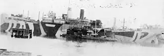 ![]() USS Montclair (ID-3497) in port sometime between August and November 1918, painted in dazzle camouflage. Another ship, of identical topside configuration, is on her opposite side.