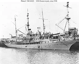 ![]() USS Owera in a United States East Coast port ca. 1918. Destroyer tender USS Prairie is across the pier.