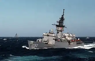 The Knox-class ships were armed with a 5"/54 caliber Mark 42 gun forward and a single 3-inch/50-caliber gun aft. They mounted an eight-round RUR-5 ASROC launcher between the 5-inch (127 mm) gun and the bridge. Close-range anti-submarine defense was provided by two twin 12.75-inch (324 mm) Mk 32 torpedo tubes. The ships were equipped with a torpedo-carrying DASH drone helicopter; its telescoping hangar and landing pad were positioned amidships aft of the mack. Beginning in the 1970s, the DASH was replaced by a SH-2 Seasprite LAMPS I helicopter and the hangar and landing deck were accordingly enlarged. Most ships also had the 3-inch (76 mm) gun replaced by an eight-cell BPDMS missile launcher in the early 1970s.[4]