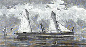 In 1863 the Confederate Government had major contracts for large and specialised British manufactures, including steam engines and boilers for ironclads under construction at Charleston, South Carolina, heavy artillery and armament-making machinery. The government's UK representative, Fraser, Trenholm & Co, arranged the purchase of Princess Royal by private investors to carry these and other supplies direct to Charleston.[2][3] The ship sailed from London on 8 December 1862 but called at Halifax, Nova Scotia, where Federal spies gained valuable information on the ship and her cargo.[4][5] After a further call at Bermuda, Princess Royal sailed for Charleston, but in the early hours of 29 January 1863 she was seen as she approached the port entrance by the Federal blockade squadron and forced aground. The captain, pilot and some passengers and crew were able to escape before boarding parties from USS Unadilla and G. W. Blunt could arrive. The ship was sent to the Philadelphia Prize court for adjudication.[3]
