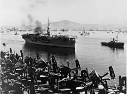 In 1941, as United States participation in World War II became increasingly likely, the US Navy embarked on a construction program for escort carriers, which were converted from transport ships of various types. Many of the escort carrier types were converted from C3-type transports, but the Sangamon-class escort carriers were instead rebuilt oil tankers. These proved to be very successful ships, and the Commencement Bay class, authorized for Fiscal Year 1944, were an improved version of the Sangamon design. The new ships were faster, had improved aviation facilities, and had better internal compartmentation.[1] They proved to be the most successful of the escort carriers, and the only class to be retained in active service after the war, since they were large enough to operate newer aircraft.[2][3]
