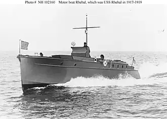 This article incorporates text from the public domain Dictionary of American Naval Fighting Ships. The entry can be found here.- Department of the Navy Naval History and Heritage Command Online Library of Selected Images: Civilian Ships: Rhebal (American Motor Boat, 1917). Served as USS Rhebal (SP-1195) in 1917-1919