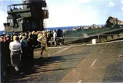 At 16:51, on 25 January, during routine flight operations, an F6F-3 Hellcat (Bureau number 40845) from VF-37 failed to hook a wire on landing, broke through the barriers, and crashed into parked planes on the forward flight deck. Its belly tank, torn loose, skidded forward, spewing flaming fuel. Fire soon spread among the planes. It raged along the flight deck and flames beat up over the bridge, making ship control extremely difficult. The carrier was turned out of the wind, so that the fire could be fought. By 16:59, it was under control. Seven of the crew died in those eight minutes. Seven others were seriously injured, and of the 15 who jumped over the side to escape the flames, 13 were picked up, two were missing.[3] The accident also destroyed four Hellcats and a SBD Dauntless was knocked overboard.[4] Later the same day, a TBM Avenger crashed into parked aircraft while landing, damaging beyond repair three SBD Dauntless' and another TBM, fortunately without serious injuries.[4]