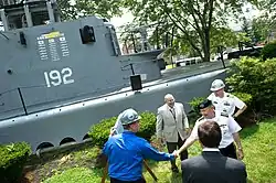 After being decommissioned on 27 October 1945,[42] efforts by the city of Portsmouth and area residents to have the submarine kept intact as a memorial were not successful.[43] Agreement was reached to have her conning tower saved, which was dedicated in November 1946 on Armistice Day, by John L. Sullivan, then Undersecretary of the Navy.[44] The remainder of the submarine was initially scheduled to be a target in the atomic bomb tests[45] or sunk by conventional ordnance. However, she was placed on sale in March 1948 and stricken from the Naval Vessel Register on 30 April 1948. The hulk was sold for scrapping to Luria Brothers of Philadelphia, Pennsylvania, on 18 June 1948. Her conning tower still stands at the Portsmouth Naval Shipyard in Kittery as a memorial to her lost crewmen (43°04′55.4″N 70°44′18.7″W / 43.082056°N 70.738528°W).[46]