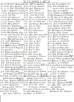 Handwritten log of Paul W.'s deployment on the USS Swivel during World War II. Paul W. began service on the Swivel in Norfolk VA and continued until being transferred in 1946. Note: the entry "Stinky Died" refers to their dog.