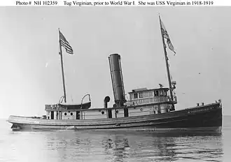 Virginian was built as the commercial tug Blue Bell[1] or Blue Belle[2][3] in 1904 at Camden, New Jersey. She subsequently was renamed SS Virginian. The U.S. Navy acquired her for World War I service from her owner, the Southern Transportation Company, at Philadelphia, Pennsylvania probably sometime in late 1917. The Navy apparently commissioned her sometime in early 1918 as USS Virginian.