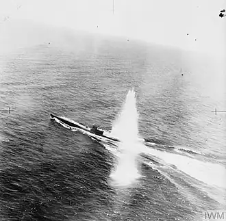 Eight days in, at 06:26, U-755 was attacked by a British Lockheed Hudson aircraft of No. 500 Squadron RAF, flown by pilot S/L H.G. Holmes, DFC, 13 nautical miles (24 km) north of Alboran Island. The aircraft was hit in the port engine by AA fire during the first attack run, but dropped three depth charges. The Hudson then made two dive-bombing attacks and dropped first two and then one A/S bomb, one of them exploding just 5 yards (4.6 m) off the port beam. The damaged engine then forced the pilot to return to base. Strafing had killed one crewman and wounded two others on U-755, which was forced to return to port due to heavy damage.[3]