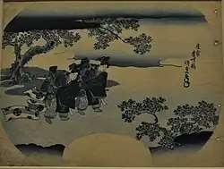 Most, if not all, major Edo period woodblock print artists worked within the uchiwa-e medium in addition to with standard prints and illustrated books. Uchiwa-e designs fall into all of the major categories of prints, including yakusha-e (actor prints), bijin-ga (beauties), fūkei-ga (landscapes), kachō-ga (nature prints) and Musha-e (warrior prints).[16] Some notable uchiwa-e works which survive in collections today are by Katsukawa Shunshō (1726-1793), Utagawa Toyokuni (1769-1825), Kunisada (1786-1865), Kuniyoshi (1797-1861) and Hiroshige (1797-1858).[17]