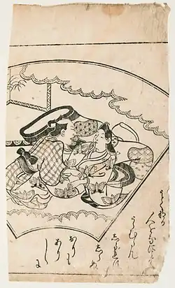 Uchiwa with printed designs were first produced in Japan sometime in or prior to the 1680s.[10] One of the earliest extant examples is a 1684 ehon (picture book) by Hishikawa Moronobu (菱川師宣) entitled Uchiwazukushi (Uchiwa Pictures of Every Variety), which includes illustrations within fan-shaped frames.[11] Other notable examples placing uchiwa-e within a socio-historical context are prints by Suzuki Harunobu (鈴木春信) from 1767 or 1768 featuring uchiwa uri (fan sellers), and an 1814 print by Utagawa Kunisada depicting kabuki actor Ichikawa Dannosuke II in the role of a fan vendor.[12]