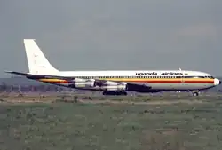 Uganda Airlines was founded as a subsidiary of the government-owned Uganda Development Corporation (UDC) in May 1976 as a replacement of the services previously operated by East African Airways.[4] It commenced operations in 1977, when Uganda Aviation Services (UAS), set up by British United Airways in 1965 but then a UDC subsidiary, was absorbed by Uganda Airlines, taking over the UAS route network.[4][5][6] Following delivery of the first Boeing 707-320C in the late 1970s, new routes to Brussels, London and Rome were inaugurated. A second Boeing 707-320C entered the fleet in 1981. That year, new routes to Cairo, Cologne and Dubai were launched, followed by Dar es Salaam, Kilimanjaro and Nairobi in subsequent years.[7]