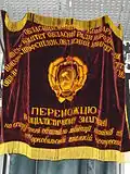 Symbolic display of road signs for the villages abandoned as a result of the disaster. To stress the tragedy of devastation, the signs are colored in black (instead of standard blue/white) and slashed with pink stripe (which designates "end of the settlement" on the actual signs). Above the signs is an authentic Khorugv from the abandoned village church.