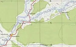 The Ulma is a left tributary of the Selemdzha. It has its origin at the confluence of the Right Ulma and Left Ulma (Bordak) in the western slopes of the Turan Range. The river flows fast in a roughly southwestern direction in its upper reaches. In its middle and lower course it first flows northwestwards and then westwards, meandering across a very marshy floodplain dotted with small lakes and oxbows.[1][5] Finally it meets the left bank of the Selemdzha 48 kilometres (30 mi) from its mouth in the Zeya, 6 kilometres (3.7 mi) downstream from Uglovoye and 8 kilometres (5.0 mi) upstream from the village of Bogoslovka.[6][1]