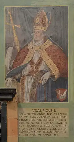 In the War of the Babenberg Succession that followed the death of Duke Frederick in 1246, Ulrich at first followed the lead of the pope, who supported the claim of King Ottokar II of Bohemia. In 1253, Ulrich visited Ottokar at Leoben.[4] In 1254, the Duchy of Styria came under Hungarian rule by treaty and Ulrich readily accepted it. That year he acquired a house in Graz that was to become the episcopal palace. In 1255, he received compensation for damage inflicted by Herrand von Wildonie.[5] He was the first bishop of Seckau recognized as a prince-bishop.[3]
