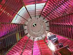 Construction started on the new light in 1892, and it was first lit in 1894. Built at the same time as Heceta Head Light, it was built from the same plans and is virtually identical to its more northern sister.[2] Unlike its predecessor, the new light had several advantages over the original light. Built 100 feet (30 m) above the river, the new light was safe from flooding. This was partly due to the Light House Board's insistence that ships be able to plot a course based on visible lighthouses. The original light was not visible at sea and was only usable as an aid to ships approaching the river. The new light used a clockwork mechanism to rotate the Fresnel lens, and was eventually automated in 1966. The rotation mechanism served in the light for 89 years before it finally broke down and was removed. The Coast Guard, in charge of the light at this point, wanted to replace the mechanism with a new one. However, strong public outcry forced those plans to be aborted, and in 1985, the old mechanism was returned to its position after being fully restored.[1]