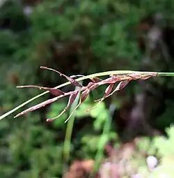 Uncinia is a genus of flowering plants in the family Cyperaceae, known as hook-sedges in Australia[3] and as hook grasses or bastard grasses in New Zealand.[4] The genus is characterised by the presence of a long hook formed by an extension of the rachilla,[5] which is used to attach the fruit to passing animals (epizoochory), especially birds,[6] and it is this feature which gives the genus its name, from the Latin uncinus, meaning a hook or barb.[7]