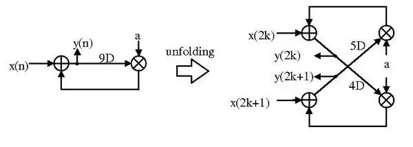 The unfolding transformation could be used to design a word-parallel architecture from a word-serial architecture. The following is the example of word-serial to word-parallel architecture.