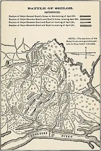 On April 6–7, Grant's forces fought the bloodiest battle of the Civil War to that time, the Battle of Shiloh, when Confederate forces advanced largely undetected from Corinth, Mississippi, and attacked the five Union divisions staged at Pittsburg Landing. On the first day of the battle, the surprised and unentrenched army fought desperately and suffered many casualties. However, long-expected elements of the Army of the Ohio, under Maj. Gen. Don Carlos Buell, arrived to reinforce Grant late that day, with many more troops arriving overnight and the following day. Grant was also bolstered by the evening arrival of his own 3rd Division; Lew Wallace and his troops had been slow arriving at Pittsburg Landing from their separate position at Crump's Landing. Substantially reinforced by Buell and Wallace, Grant counterattacked the Confederate forces on April 7 and drove them from the field and back toward Corinth.[38] "Grant's victory at Shiloh," one historian has written, "bloody and bitter though it was, doomed the Confederate cause in the Mississippi valley."[39] In the near term, however, the battle resulted in much criticism against Grant for lack of preparedness, swift promotion to major general of volunteers for Sherman, capture for Prentiss, a fatal wound for W.H.L. Wallace, and Grant's loss of confidence in Lew Wallace. In addition, C.F. Smith died later in April from complications due to his non-combat leg injury.[40]