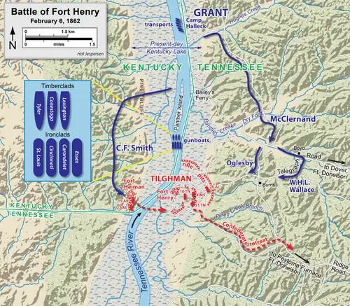 On December 20, Grant's command was reconfigured to include C.F. Smith's and renamed the District of Cairo (also headquartered at Cairo, Illinois).[18] From that perch, in February 1862, Grant led the Union campaign against Fort Henry, on the Tennessee River, and Fort Donelson, on the Cumberland River.[19] His troops for this campaign eventually numbered approximately 27,000 men, divided into three divisions commanded, respectively, by John McClernand (1st Division), C.F. Smith (2nd), and Brig. Gen. Lewis Wallace (3rd).[20]