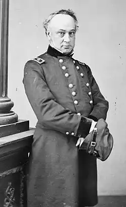 In early March, Grant's superior, Maj. Gen. Henry W. Halleck, then in command of the Department of the Missouri, assigned Grant to lead an expedition up the Tennessee River from the recently captured Fort Henry. On March 4, however, Halleck ordered Grant to give field command of the expedition to C.F. Smith; this order has been variously attributed to professional jealousy and to Halleck's lacking confidence in Grant due to certain administrative difficulties.[32] Smith initially established the expedition at Savannah, Tennessee, a town on the east side of the river approximately 100 river miles (160 km) south of Fort Henry. He soon began staging troops at a point—Pittsburg Landing—nine miles (14 km) further south and across the river.[33] Meanwhile, Halleck's command was enlarged and renamed the Department of the Mississippi, and Halleck restored Grant to field command, perhaps because of personal intervention by President Abraham Lincoln.[34] Grant joined his army in the field on March 17.[35] By early April, Grant's army had grown to a total of roughly 50,000 men, organized into six divisions.[36] The three new divisions were commanded by Brig. Gen. Stephen A. Hurlbut (4th Division), Brig. Gen. William Tecumseh Sherman (5th), and Brig. Gen. Benjamin M. Prentiss (6th). In addition, Brig. Gen. W.H.L. Wallace took command of Smith's 2nd Division due to the latter's having suffered a debilitating leg injury.[37]