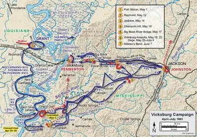 In the early months of 1863, Grant pursued various futile operations seeking to capture Vicksburg from the north, causing one newspaper to complain that the "army was being ruined in mud-turtle expeditions, under the leadership of a drunkard [Grant], whose confidential adviser [Sherman] was a lunatic."[70] However, in April Grant proceeded to establish his troops well south of Vicksburg by marching them down the west side of the Mississippi and crossing it with the aid of the Navy. Working well with the Western Flotilla under Acting Rear Admiral David D. Porter, Grant led approximately 40,000 men in the XIII (McClernand), XV (Sherman), and XVII (McPherson) Corps through the Vicksburg Campaign, a masterful 180-mile (288 km) campaign of maneuver against two Confederate armies, Pemberton's Vicksburg force and a relief force under General Joseph E. Johnston. After capturing and briefly occupying Jackson, Mississippi, on May 14, and winning the Battle of Champion Hill on May 16, Grant failed in initial assaults against the Confederate entrenchments at Vicksburg on May 19 and 22 and then settled in for siege operations rather than incur additional casualties.[71]