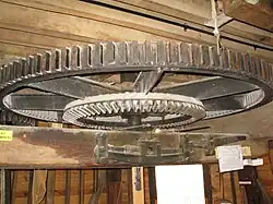 The four patent sails are now carried by traditional wooden stocks. When the mill was restored in the 1950s, the Dutch millwright Christiaan Bremer of Adorp, Groningen was employed,[16][17] and he made the stocks in the Dutch style. Although these stocks served the mill for over forty years, they did not represent Kentish practice and were not in accordance with the Code of Practice of the Society for the Protection of Ancient Buildings covering mill restoration and repair. The stocks pass through the canister on the cast-iron windshaft, and this carries the brake wheel. The brake wheel drives the wallower, at the top of the upright shaft, and a sack hoist. At the bottom of the upright shaft is the great spur wheel, which drove three pairs of millstones, of which two remain. These are driven overdrift. A crown wheel drove auxiliary machinery.