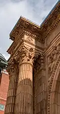 The structure consists of a recessed semicircular arch flanked by four fluted round Corinthian columns. An angel relief is carved into each of the arch's spandrels. Above the spandrels and columns is an architrave; above that is a frieze with decorative eagle medallions, and which once had "Union Station" inscribed in its center. A denticulated cornice is situated above it. Several elements from above the cornice are today kept in storage: a wider frieze featuring triglyphs and alternating medallions with classical busts, another denticulated cornice with gargoyles, and statue groups (once situated on pedestals above the Corinthian columns).[3]