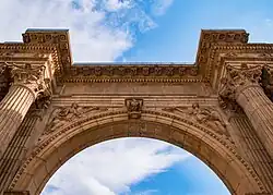 The arch was disassembled and moved to a site nearby in April 1977, and was reconstructed in the new landscaped "Arch Park" in October 1979; the .7-acre park opened on June 7, 1980.[8][9] In March 1999, the arch moved to its current location, as the Arch Park site made way for a Nationwide Insurance parking garage.[10][2] A set of decorative cherubs and medallions topped each of the ends at the top of the arch; the pieces were removed and placed in storage during the move to McFerson Commons and have not been restored atop the arch since then.[11]